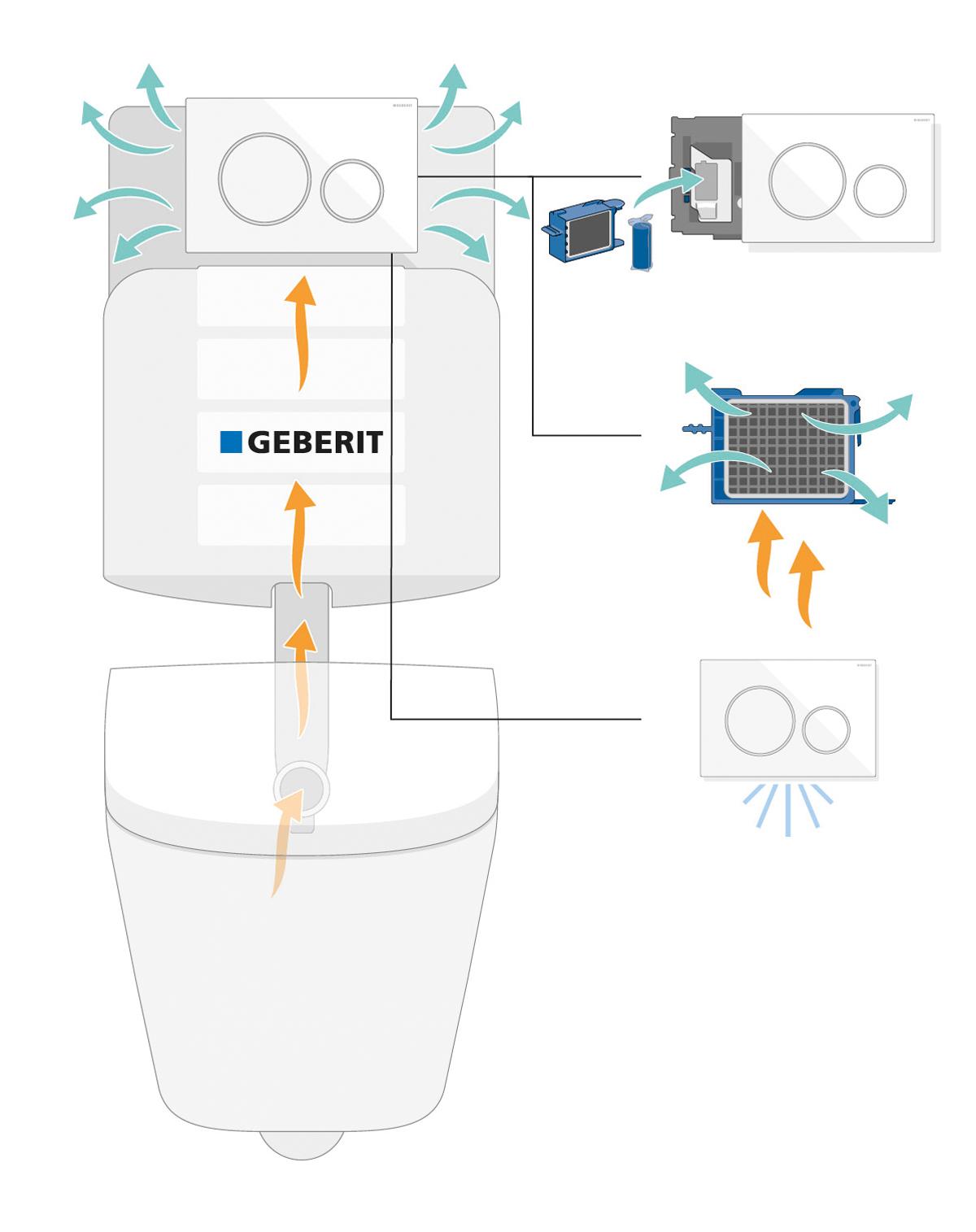 Vor diesem Hintergrund hat Geberit eine neue Geruchsabsaugung entwickelt, die sich sowohl für die Neuinstallation als auch für den nachträglichen Einbau eignet. Technische Voraussetzung für einen nachträglichen Einbau ist, dass ein Geberit Sigma Unterputzspülkasten oder ein Geberit UP300 ab Baujahr 2001 vorhanden ist.