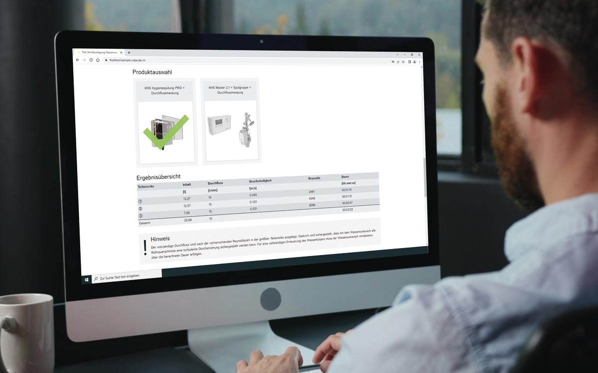 Das Flushtool errechnet die notwendigen hydraulischen Daten für den geforderten, gebäudespezifischen Wasseraustausch und schlägt dem Nutzer direkt geeignete Spültechnik-Produkte vor.